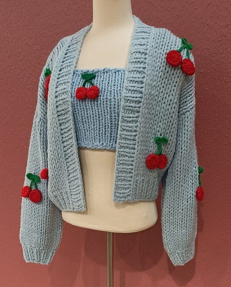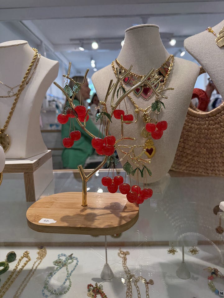 Whether it’s one of the Muma World dresses or this precious Boden sweater, or these stunning glass cherry earrings I found at Obligato, cherries are it.