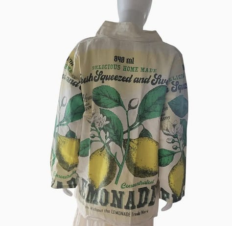 Clearly trending across both NY summer markets were lemons. I adored this flour sack jacket from Evergreen, and it may be getting added to cart when back in stock. Fun Fact: Flour was once packaged in cotton sacks. Americans would use them as rags, towels, etc. When the Great Depression hit, we started using them for clothing. When flour manufacturers learned of this practice, they began creating flour sacks with colorful patterns. It served Americans and stands as a brilliant, organic marketing move.