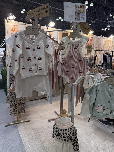 Cherries are everywhere. At NY NOW, I found them on purses from Tiana Designs, a sweater set from Knit Bon Bon, even these darling baby clothes from Viverano.